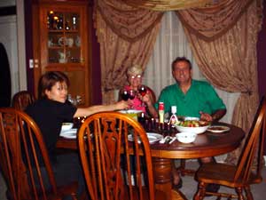 | ウエルカムディナーはKenがとっても大きなステーキをお庭で焼いてきてくれました!他にもGeneの手作り料理に舌鼓を打ちながら、ワインが大変進みました♪ワインは日本のフルボトルのサイズより大きい、リッターサイズのボトルが普段飲まれているようです。サラダには日本人には味わい慣れない味のドレッシングを、試させて貰ったりといろんな発見の連続でした!これまでのいろんなハプニングの話を肴に、大いに笑いながら楽しいディナーになりました♪ | |